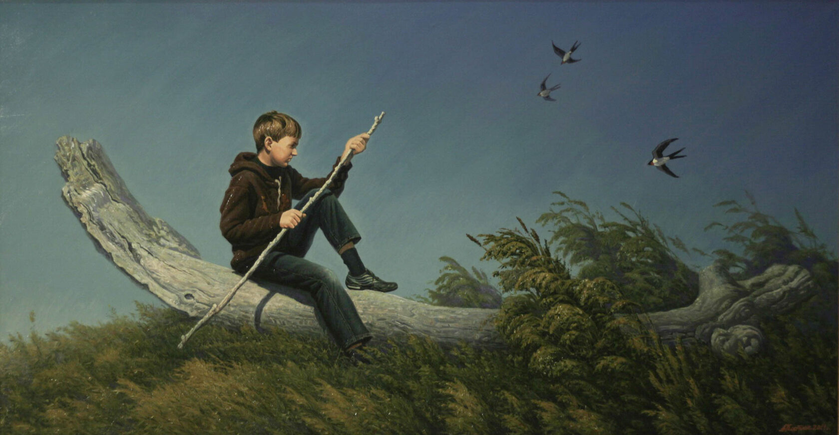 «Мальчик на древне-лодке, плывущий в травах это почти автопортрет. Конечно, реально мне позировал мой сын, но здесь есть связь с моим детством»